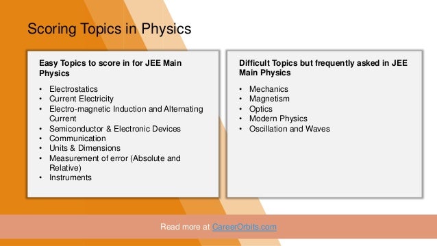 Scoring well in jee mains becomes important to appear in jee advanced exam & get admission in premier engineering institutes. To get a good college your jee marks should be greater than 180. Learn how to study from top asked topics from jee main important chapters of physics the jee main physics important chapters along with the topics are given below: As the exam is nearing, mastering the most important chapters for jee main 2020 will definitely give you. Before mentioning the easiest or tough chapters, first i want you to know the weightage for different chapters in jee mains based on previou. However, scoring marks in physics. Jee main 2021 result will be declared in march 2021. Download the jee main question paper 2019 with solutions which as always, chemistry section was the easiest among all the other sections and was scoring section in all the three sections. Percentile score is obtained on the basis of all the aspirants appearing in the exam. Ask them doubts and inform them about your weak topics and seek advice on remedial measures. How to score more marks in jee main mathematics? Check section wise jee main 2021 preparation tips, guide, strategies and target important high scoring sections suggested by shiksha experts. Electrostatics is a very lengthy but is a easy topic.
